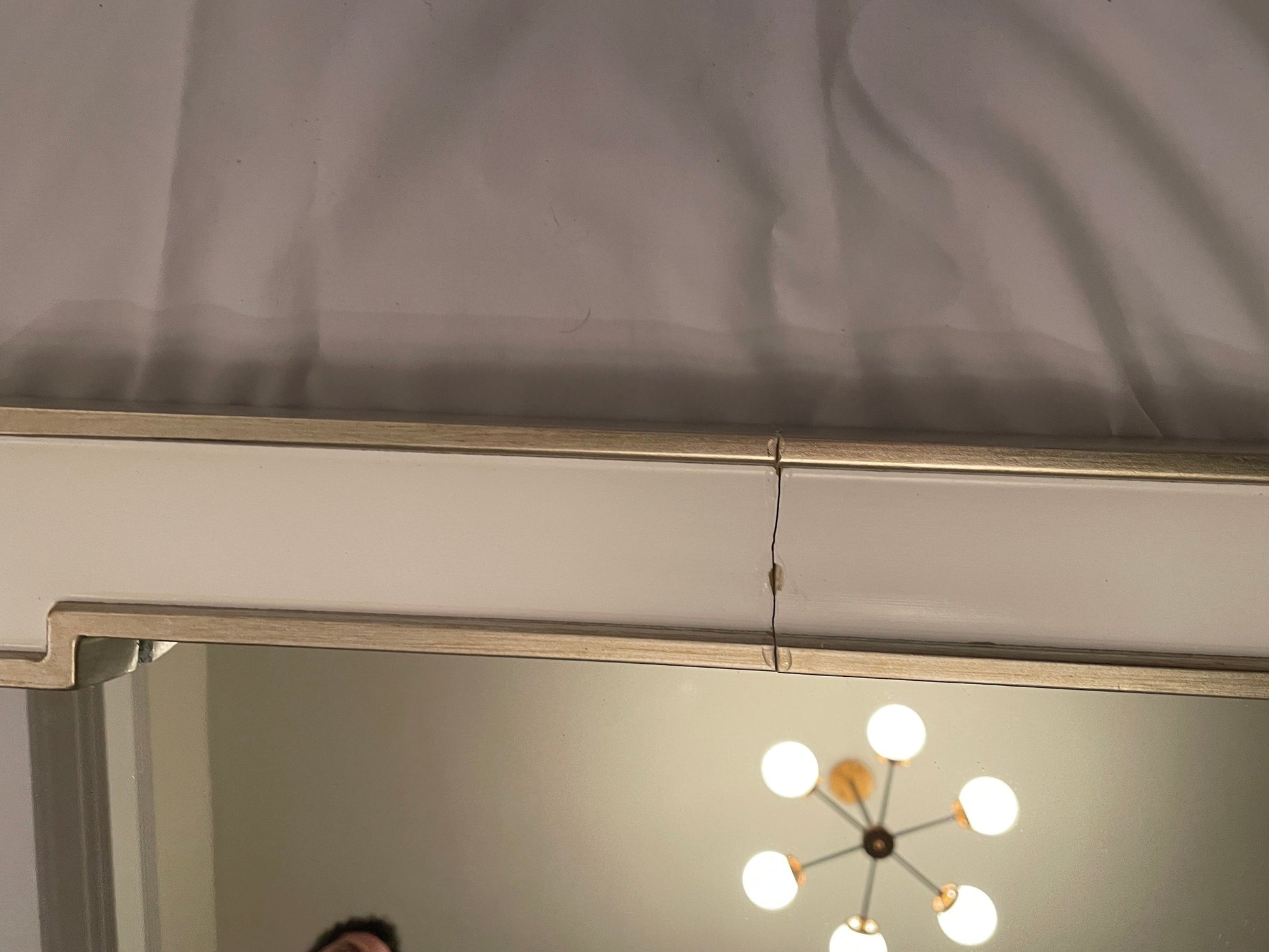 This mirror has a crack in the frame that has been glued. it could be wood filled and painted if desired. Retail is $409, but listing price reflects the crack. New, never even hung on our wall.