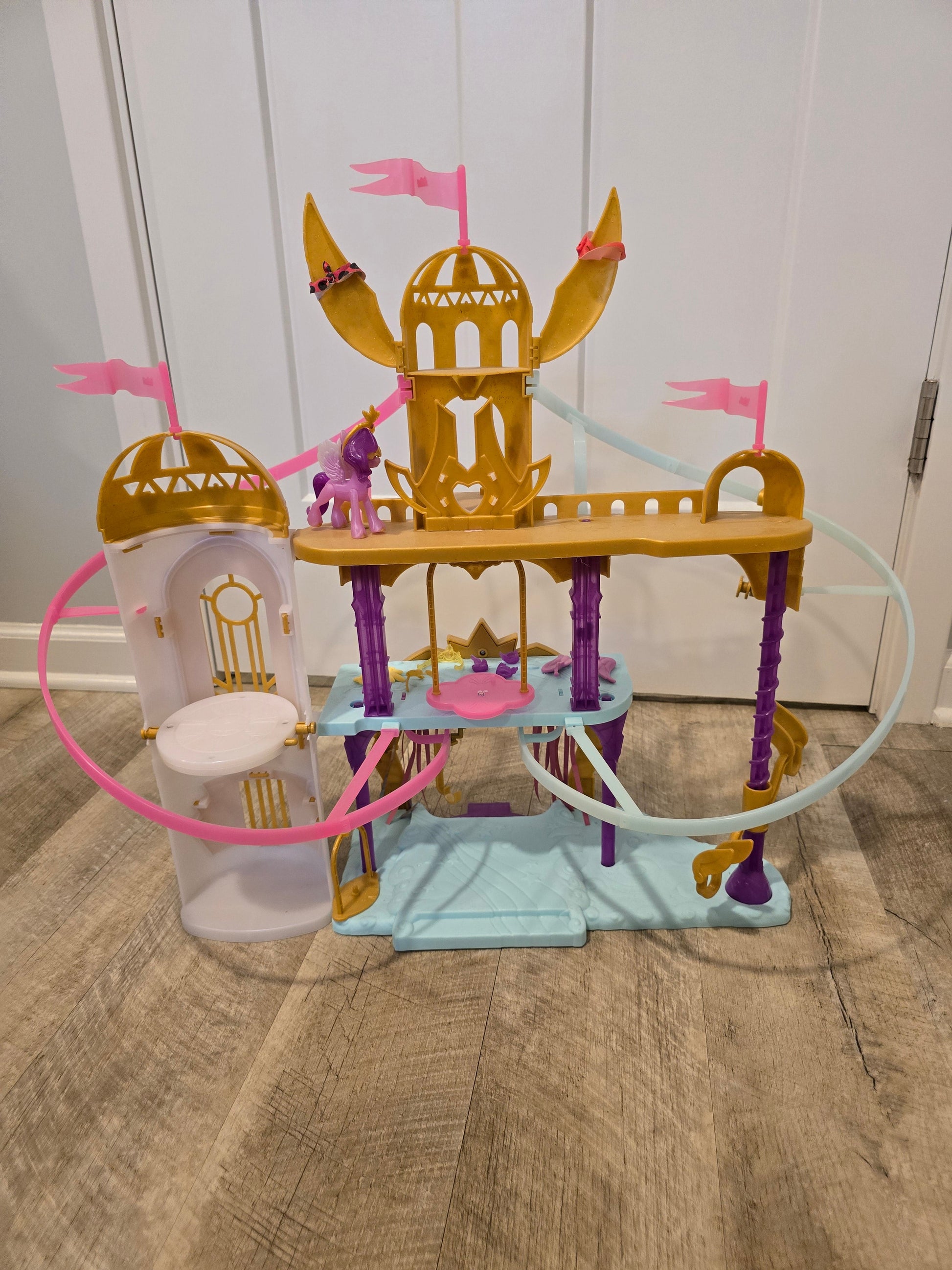 VGUC My little pony A New Generation Movie playset. Comes with purple pony with accessories (see picture & bandanas on turrets). Has a "zip line" on either side with a swing you put the pony on and they ride down. Also has a pony spinning seat, swing and a flip floor.