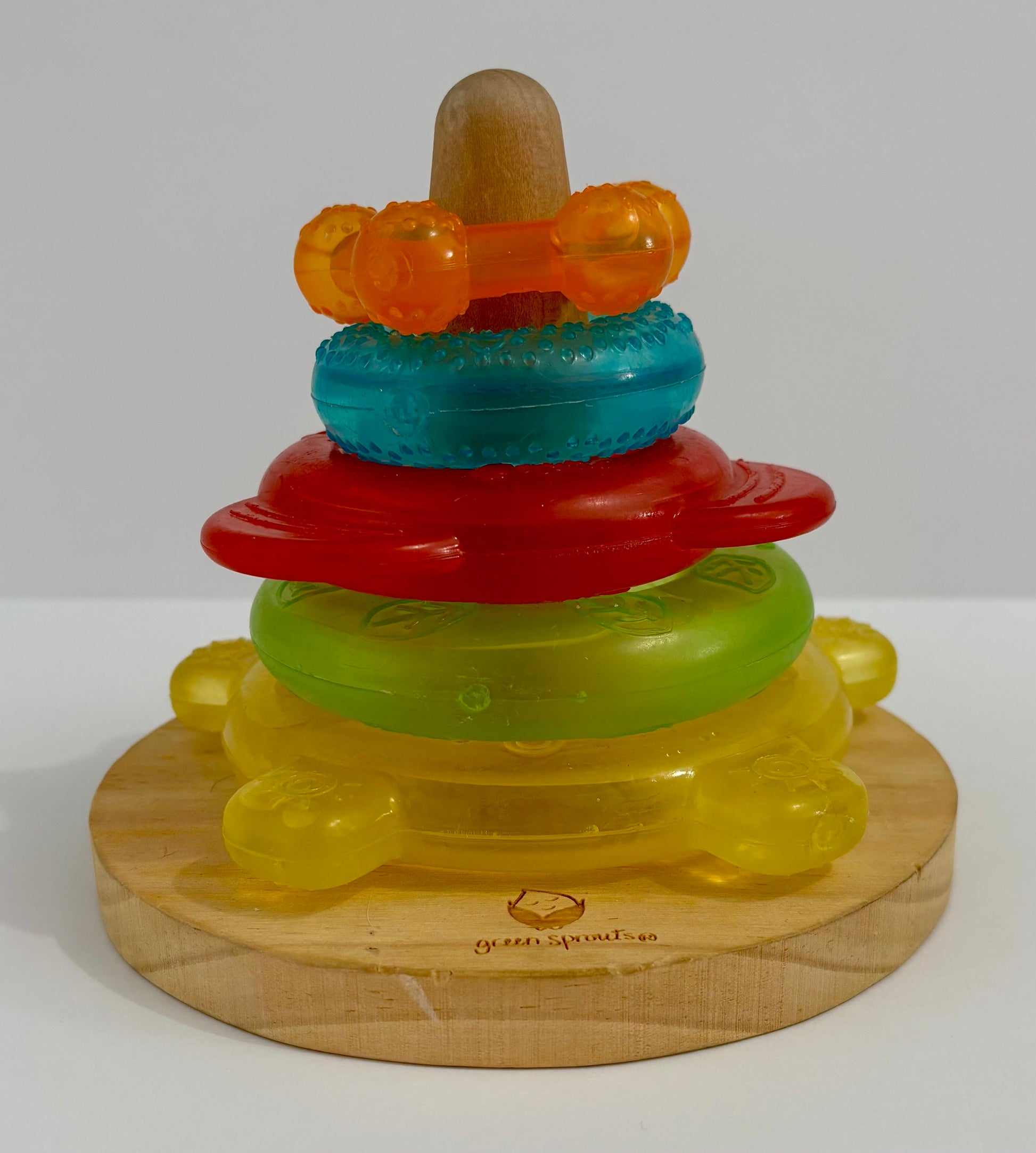 - Comes with a natural wood base and the teethers have textured surfaces to soothe and stimulate gums