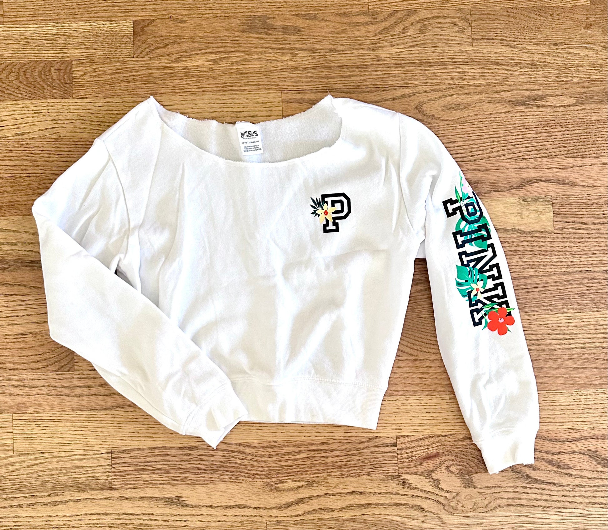 #198- Women’s/Juniors, Victoria Secret PINK, White Boat Neck Sweatshirt- Size XS
