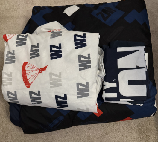 Twin size flat/ fitted sheet, 2 pillow cases, comforter. Comforter is reversible and shown on full size bed