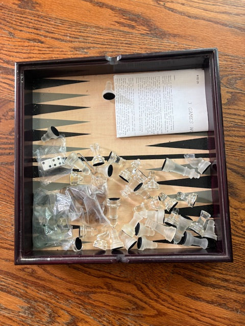 Multiple games in one. Glass top as well as glass pieces. Dusty from storage, but unused. Some piece is still in original bag.