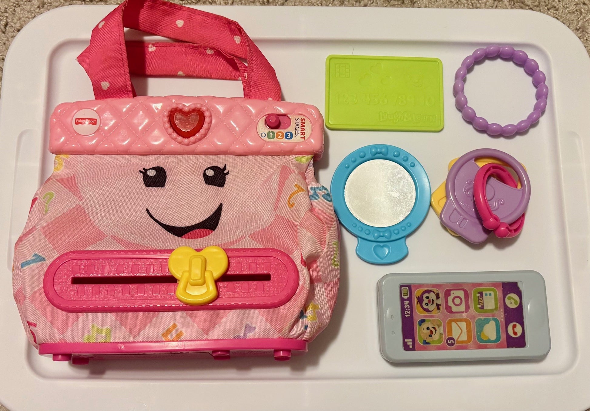 GUC for wear on fabric but all pieces included. Amazon.com: Fisher-Price Baby & Toddler Toy Laugh & Learn My Smart Purse with Lights, Learning Songs & 5 Accessories for Infants Ages 6+ Months (Amazon Exclusive) : Toys & Games