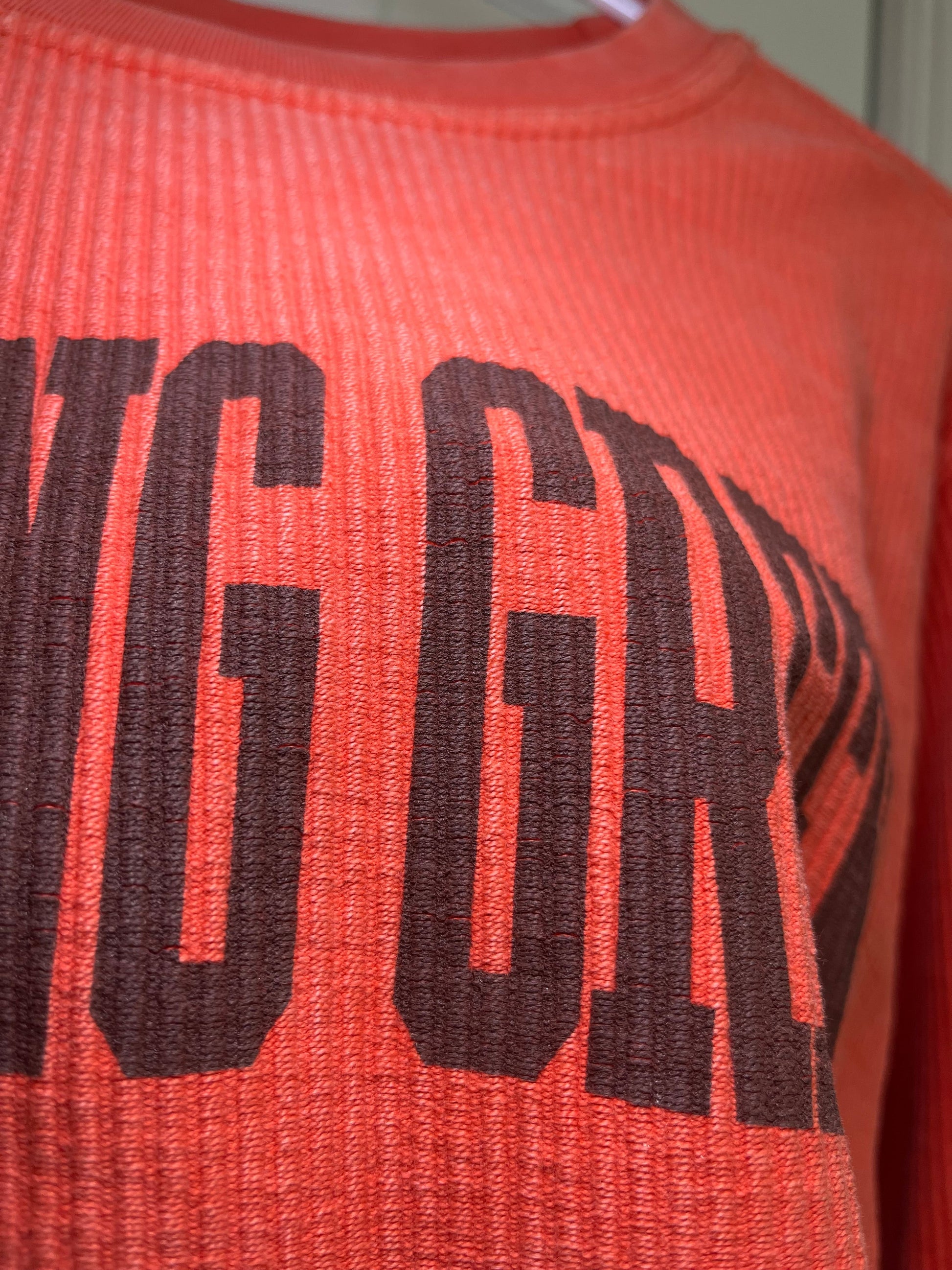 shirt is a **washed** orange color with a ribbed texture on the exterior