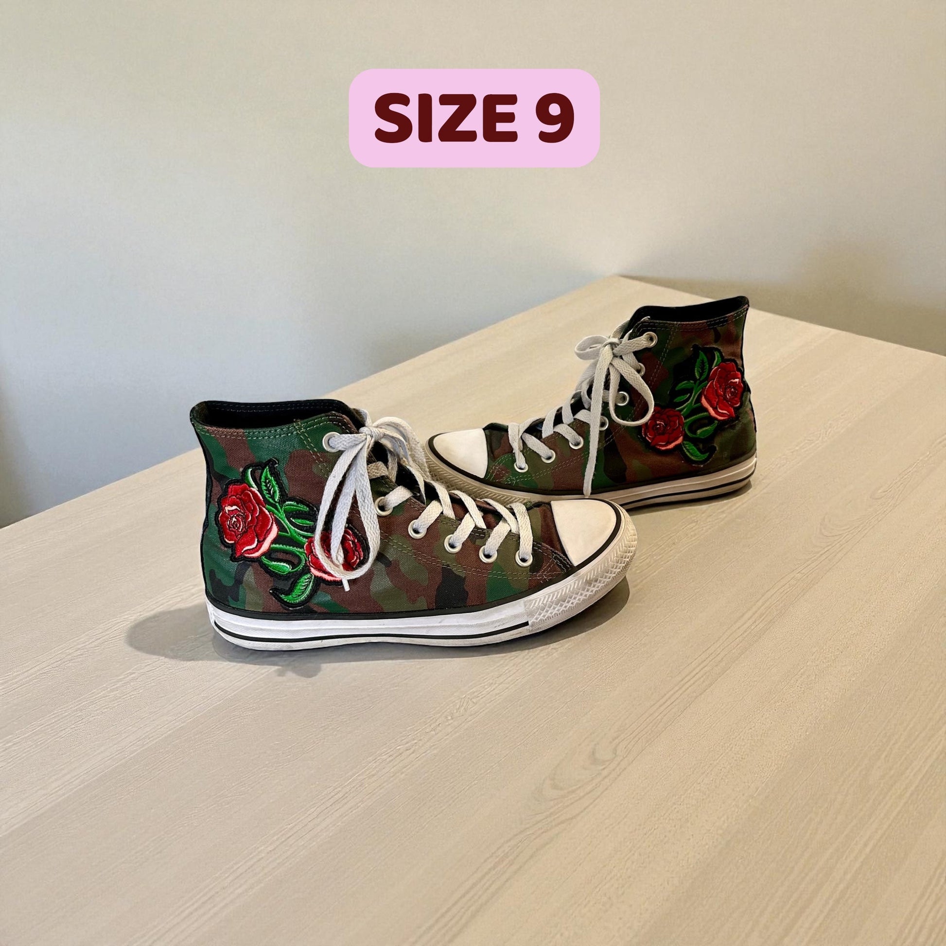 #77 GUC Camo Converse All Star w/ Rose, Women’s 8
