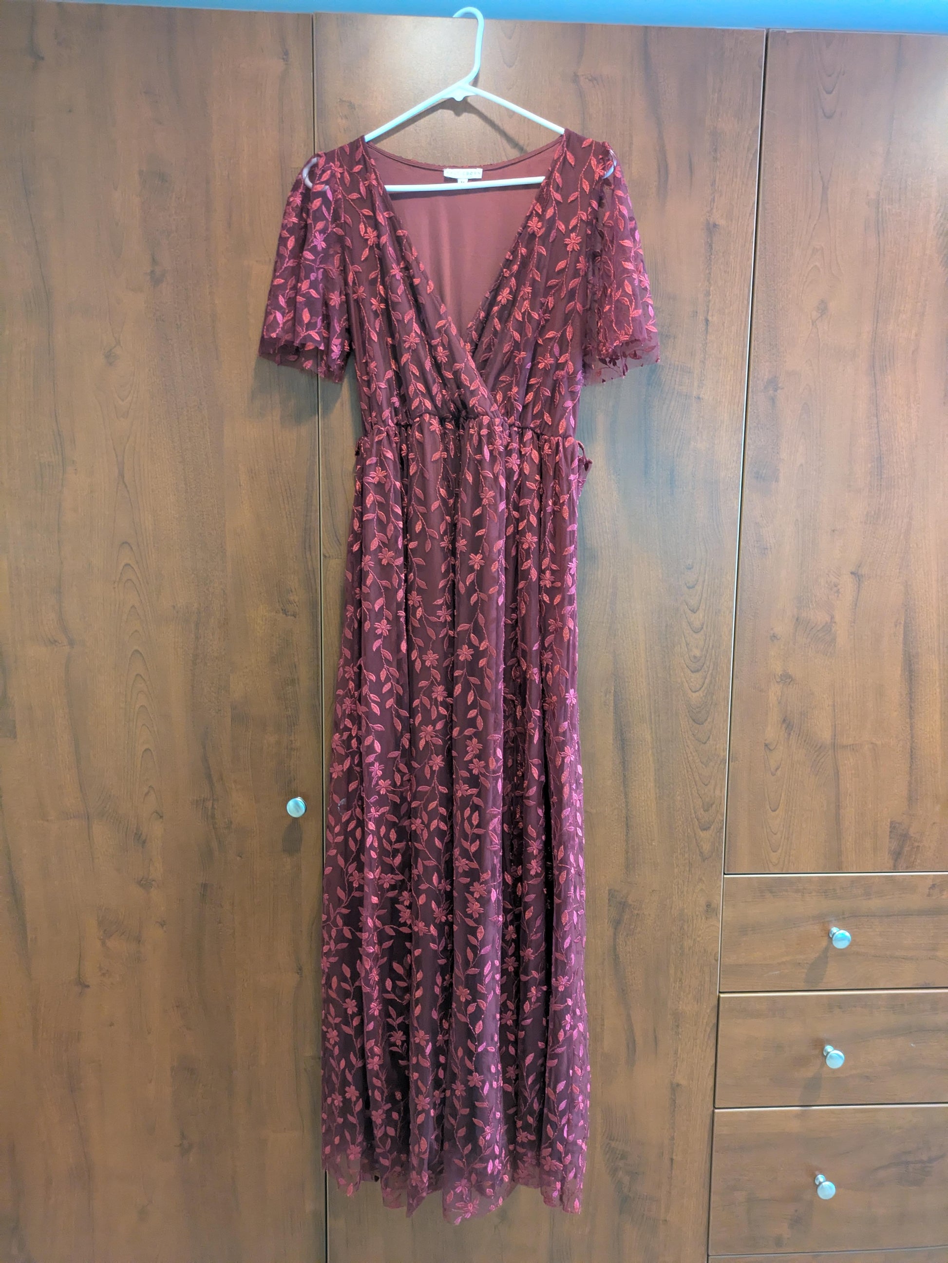Dark red color perfect for a fall event! Some minor thread pulling as noted in last photo. Included stock photo for better idea of fit, but stock photo is not correct color. I wore this dress not pregnant, but it is also categorized as "bump-friendly"! Retails for $136.