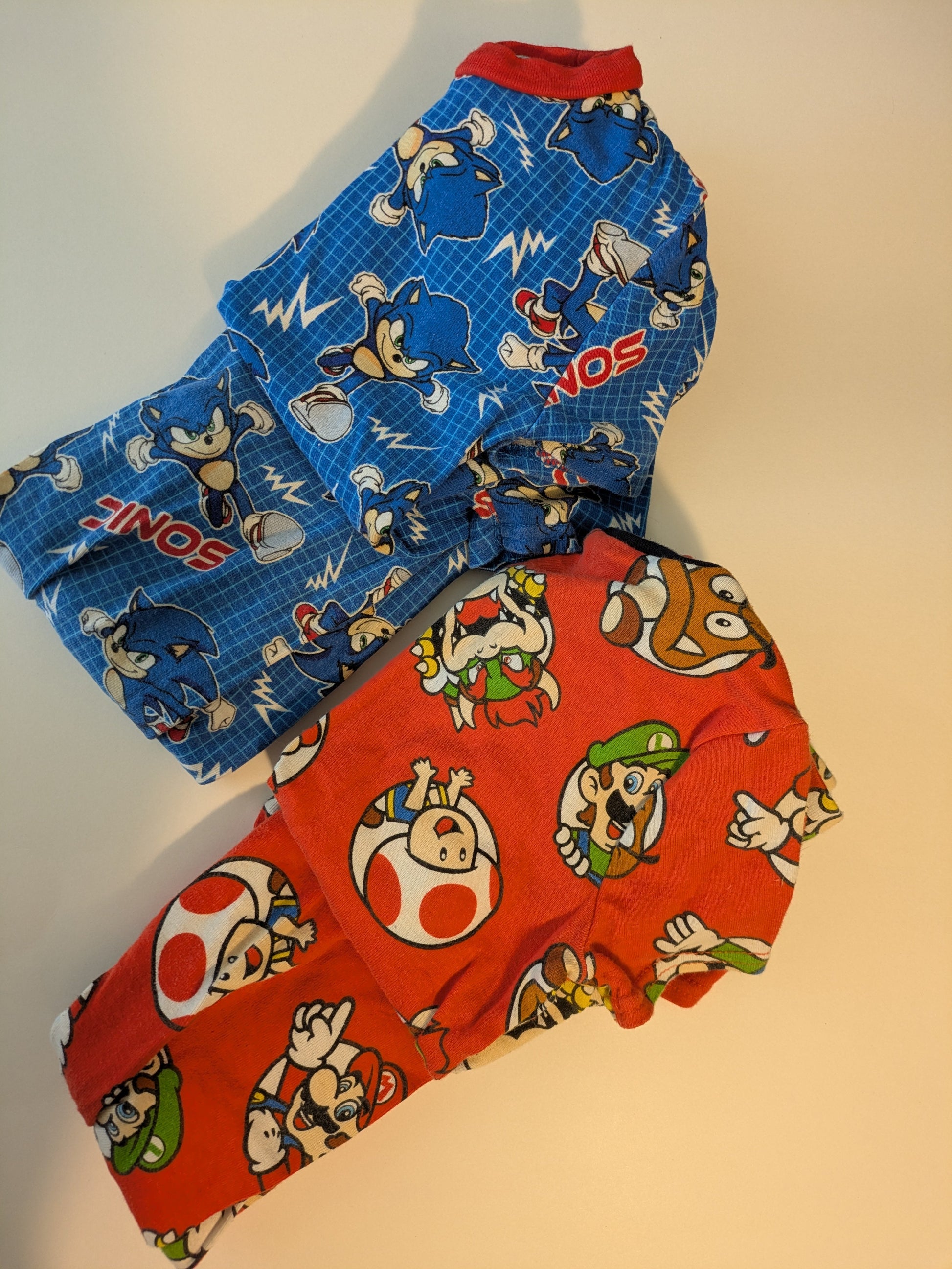 Each pair is long pants and short sleeve shirt. Blue is Sonic print and red is Super Mario print.