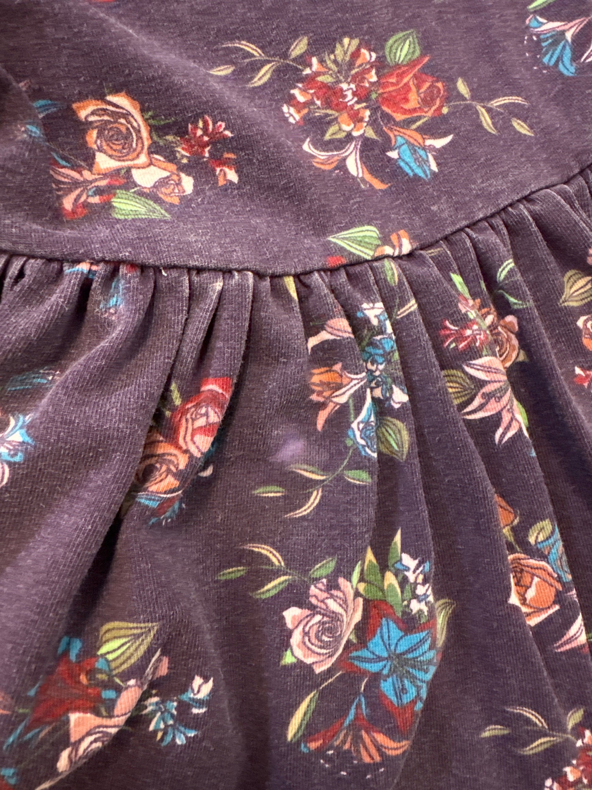 Matilda Jane size 2 purple floral dot with ruffle polka dot trim. Close up shows a small stain and the mild wash wear common with this dress.