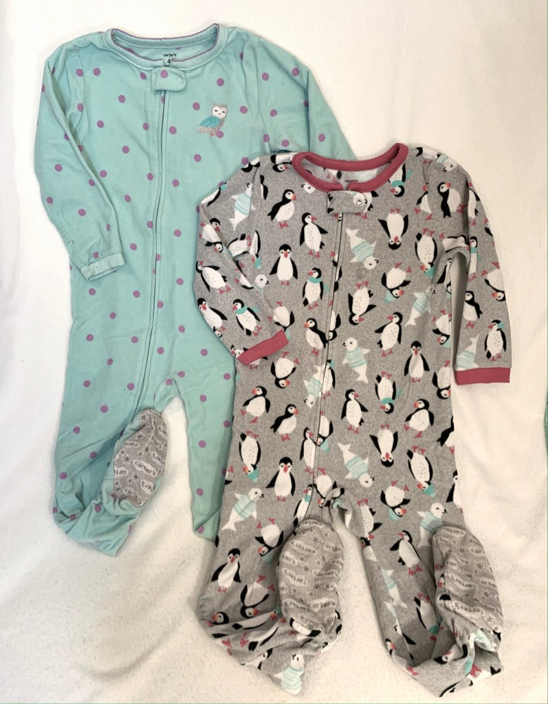 Set of 2 pairs of Carter's fleece footie pajamas in size 4T - aqua owl and grey penguin/seal designs. In good used condition with non-slip feet in that are also in good condition. Soft, cozy and easy for winter sleep.