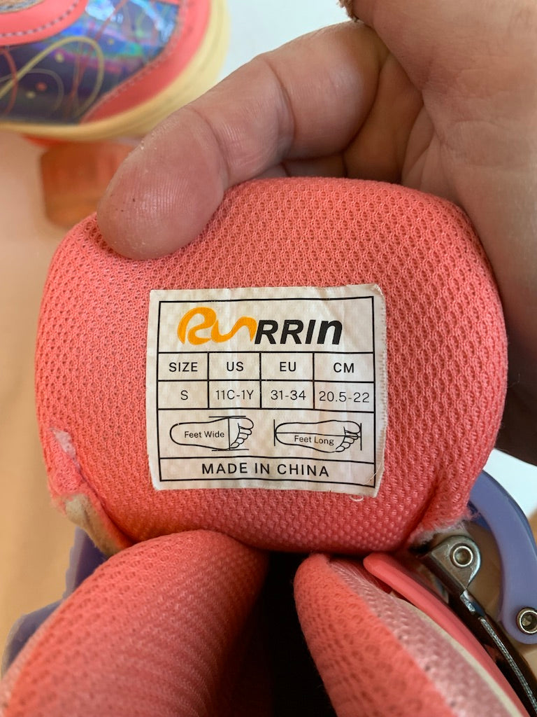 Adjustable Size 11-1Y Roller Skates in Peach / Purple - these are loved but still in good condition. The laces, velcro strap and buckle all make for a secure fit, while the base of the skates can expand with the push of a button to go from a size 11 to a size 1. So convenient and the adjustment feature works great. Wheels light up for extra fun!