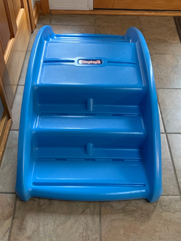 Blue plastic Simplay 3 Rocking Bridge toy in excellent condition. This toy was AMAZING! One side allows little ones to practice steps, climbing, sitting... flip it over and it's a teeter totter for 4 or even more little ones to sit in and rock! It's also amazing for imaginary play - as my kiddos got older they used it as a boat, a pirate ship, a mountain, a stage, chairs and beds for stuffies, a puppet stage, a wall or divider, a store counter... the list goes on! When not in use it can be stored on it's side and even used as a shelf or counter top in your playroom, making it compact and so versatile. Please note, the light blue "stripes" that appear in the picture on the side are just light reflecting from a window - it does not have discolorations and was almost always kept indoors, although it can be an indoor or outdoor toy. This sells for $100+ new and would make a fantastic Christmas present for a baby or toddler.