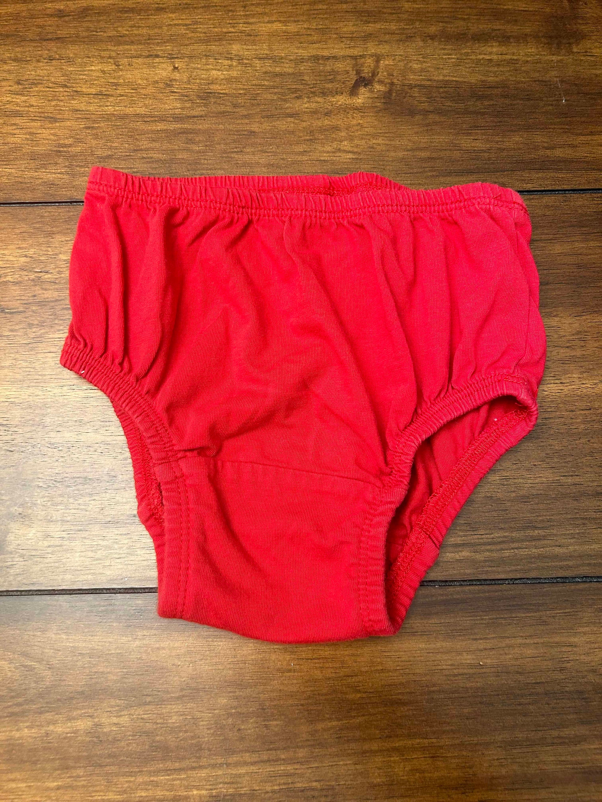 Ruffle on bottom, Heart pockets on front, 2 snaps on back of dress, Red diaper cover included (see pic)