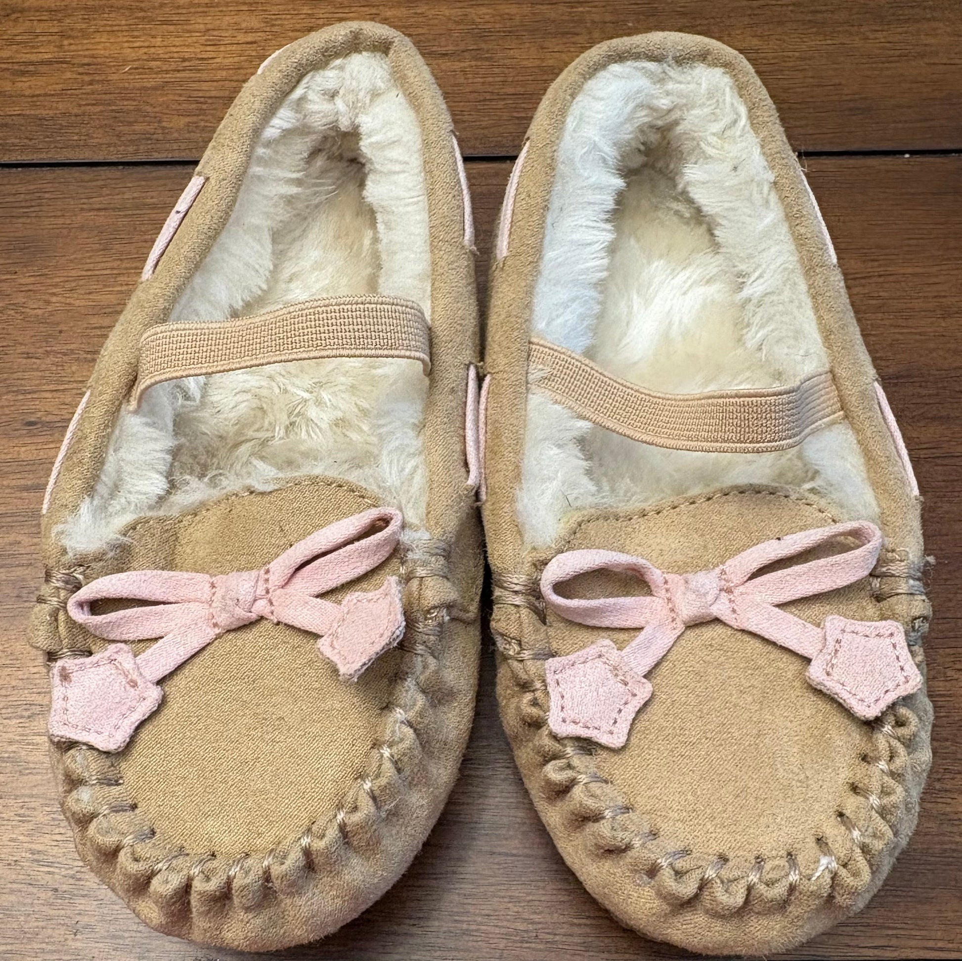Seller #210 Girls Size 7/8 (M) Khaki with Light Pink Fleece Lined Moccasins