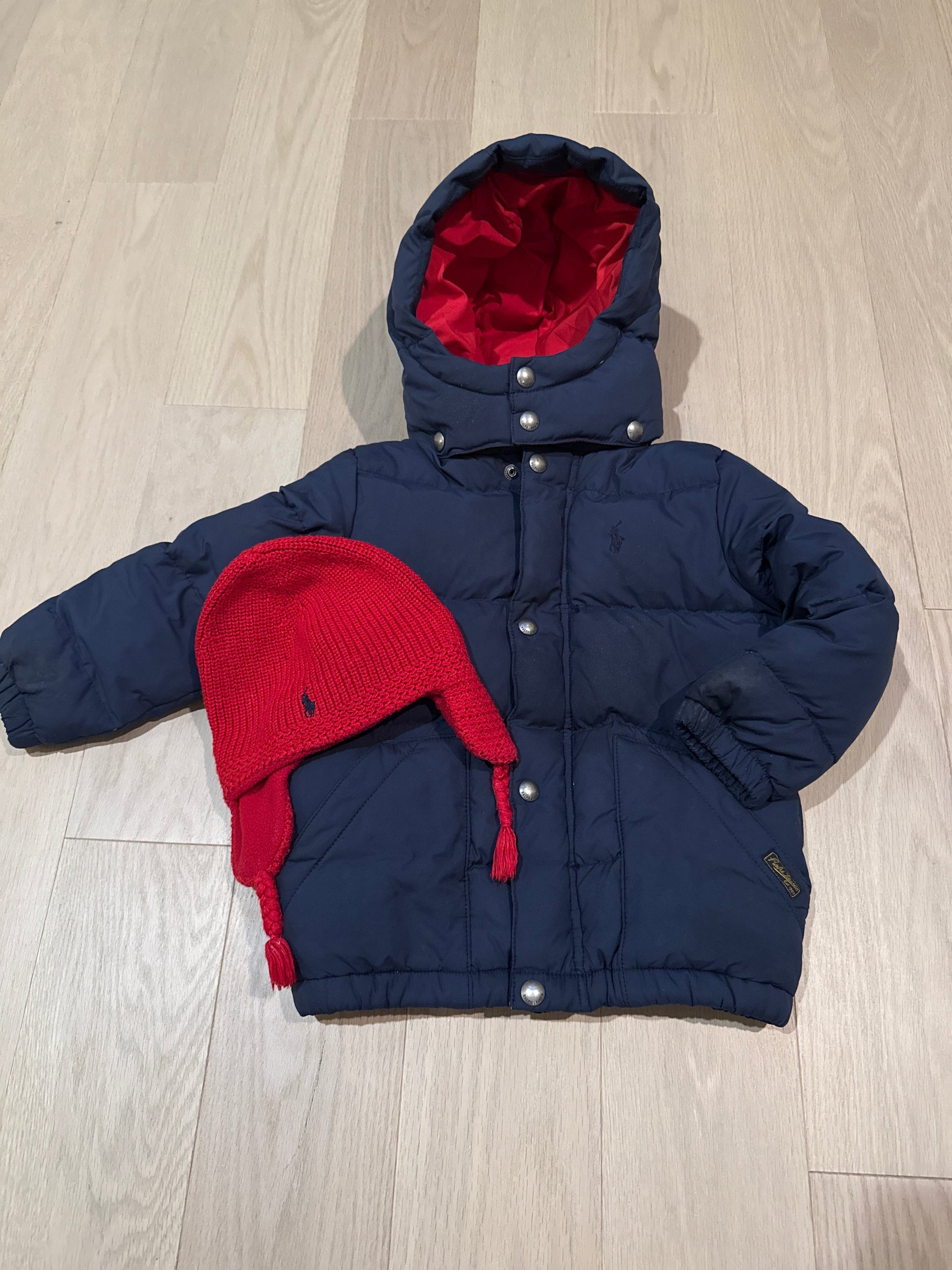 Seller #216 Boys Polo Ralph Lauren navy heavy down winter coat with red hat, sz 4T EUC