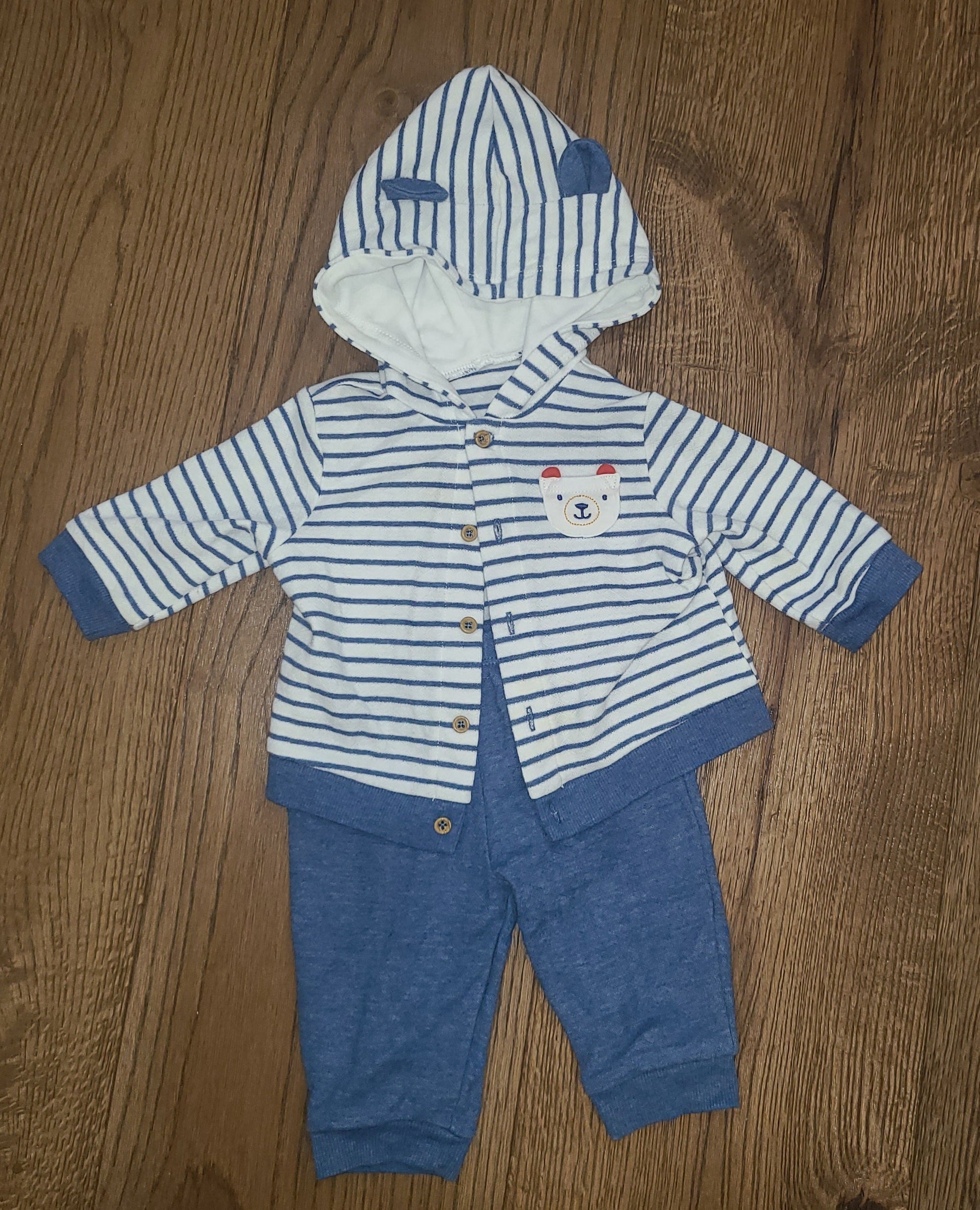Boys 3-6 month outfit. Blue striped sweater + blue pants. There is no brand on this outfit but good quality. One of our favorites!