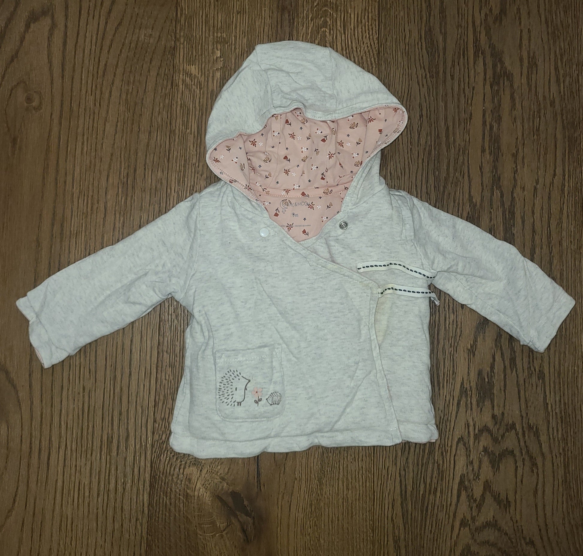 Mac & Moon brand 100% cotton jacket for 6-9 month girl in gray. The pocket has hedgehogs on it. There is some slight discoloration on the jacket but not noticeable when button, priced accordingly.
