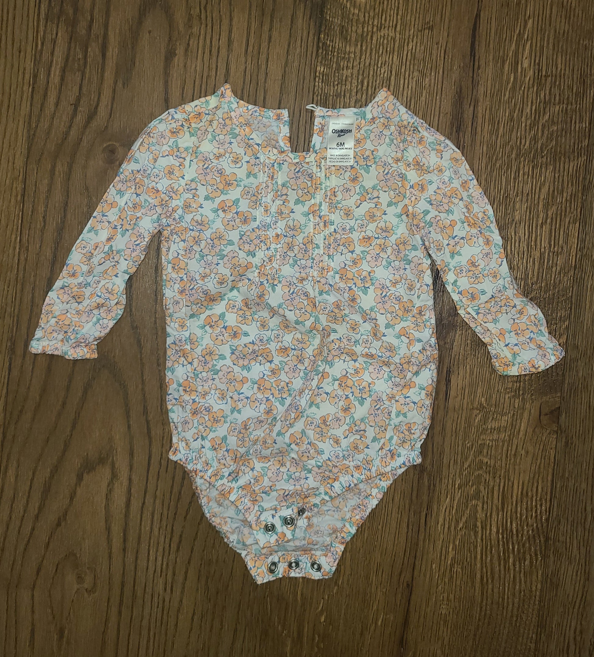 OshKosh B'gosh long sleeve girls 3-6 month body suit in a floral pattern.